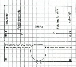 The originals were made from linen approximately 17" wide. The modern equivalent would be white linen dish-towel fabric, if you can find it. A good solution is a soft vintage linen tea-towel; if all-white and in sound condition. Each towel will probably allow you to make two shirts. The benefit of using 17" wide fabric is that the selvedges form the sleeve edges and center-front edges, thus requiring no hemming except at the bottom of the shirt. If you cannot find 17" wide fabric, you’ll simply have to do the additional work of hemming the sleeves and center front edges.
